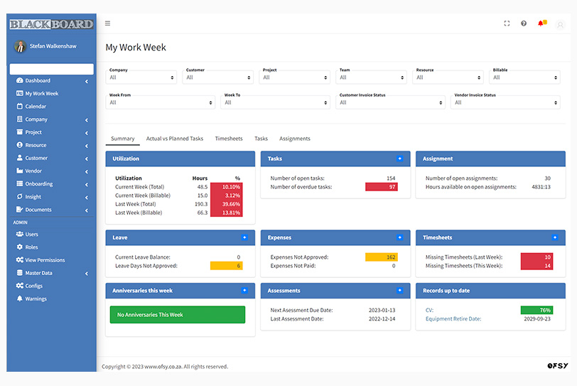 Ofsy was developed over many years to assist a consulting practice with administration tasks that allowed management to focus on running a practice rather than running after people and paperwork. Ofsy digitised and automated as many laborious tasks as possible and combine information from day-to-day activities to be able to manage productivity, finance, communication, and exceptions.